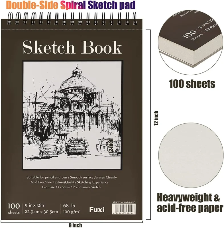 fuxi 9 x 12 inches Sketch Book, Top Spiral Bound Sketch Pad, 3 Pack 100-Sheets Each (68lb/100gsm), Acid Free Art Sketchbook Artistic Drawing Painting Writing Paper for Kids Adults Beginners Artists