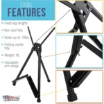 Sturdy tripod easel that’s made with premium quality lightweight tubular aluminum metal for extra stability. The back leg allows easel angle adjustments. The non-skid rubber feet that provide added stability and also protect tabletop surfaces.