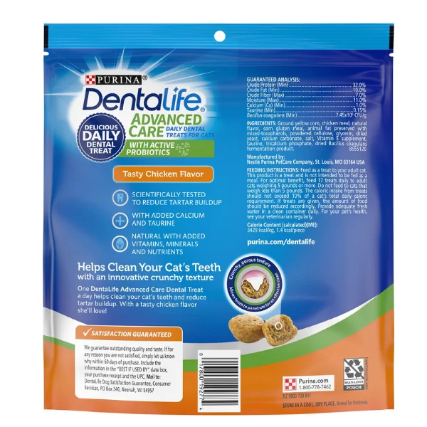 - These dental cat treats are packaged in a reclosable pouch and bursting with a tasty chicken flavor cats love and a crunchy texture that invites her to nibble!