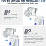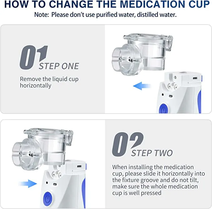 ?Cleaning Steps?1. Press the button on the back of the nebulizer and remove the liquid cup. 2. Fill the liquid cup with tap water (do not exceed the maximum scale), reinstall and fix it. 3. After starting the machine to clear the blockage, it can work normally.